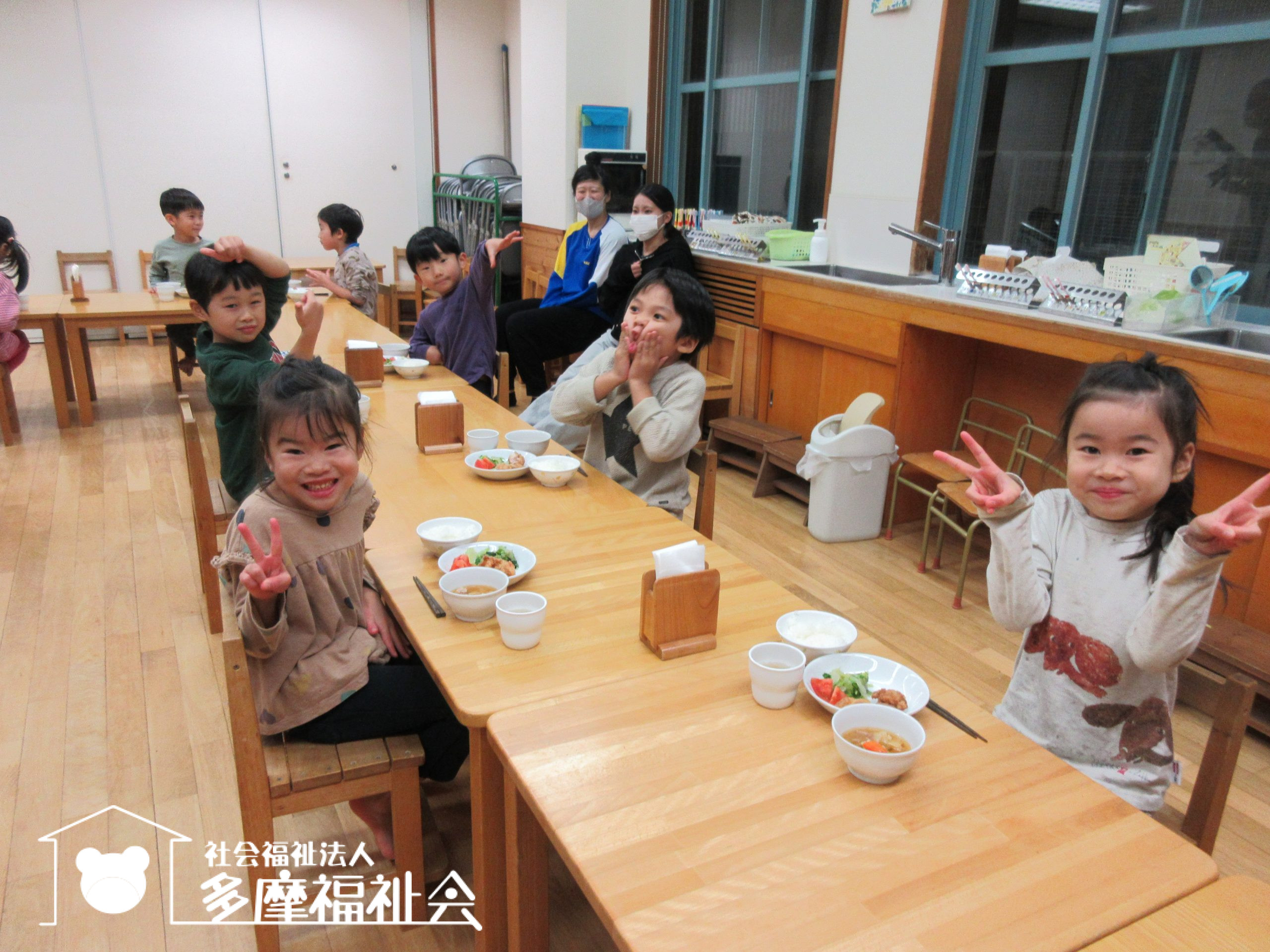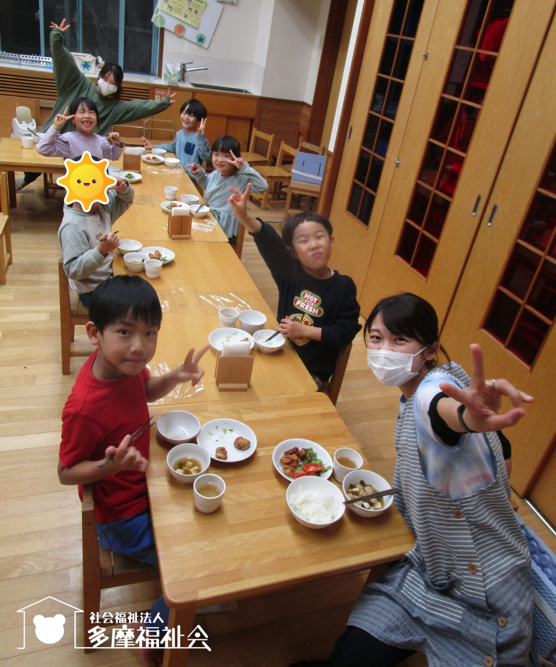 給食の先生に野菜を渡します。今夜の夜ご飯は唐揚げとサラダ、味噌汁です。