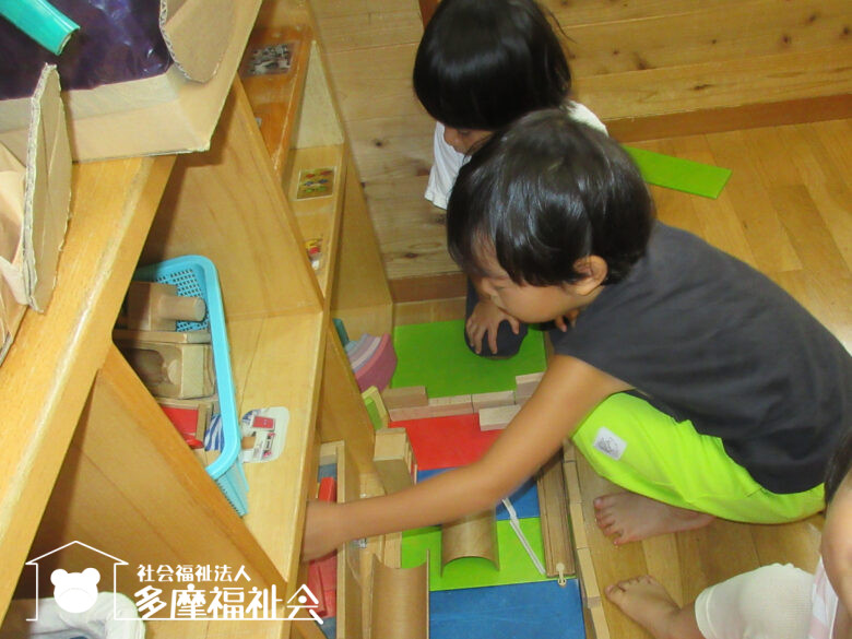 お部屋では、気に入ったおもちゃを手に取ると、すぐにお友だちとの関わりが生まれます。