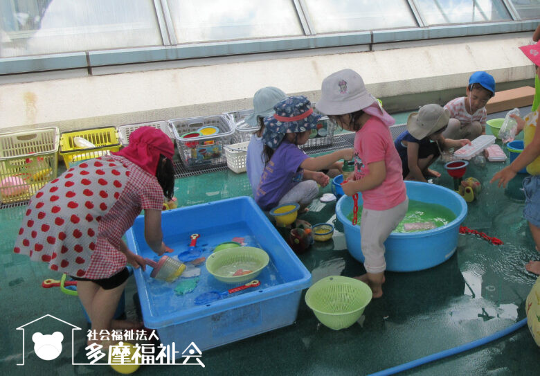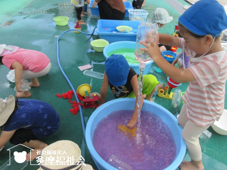 午前中は2階のテラスで水遊びをしました。つぶ氷を触って冷たさを感じたり、