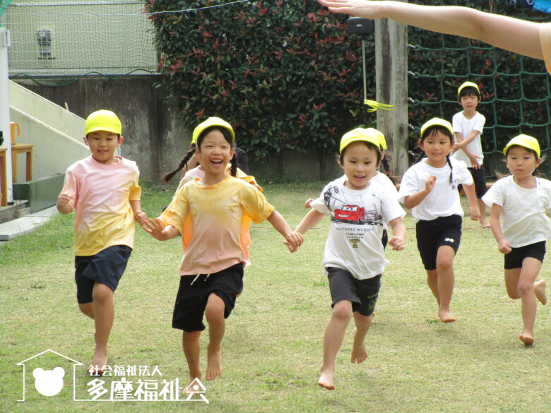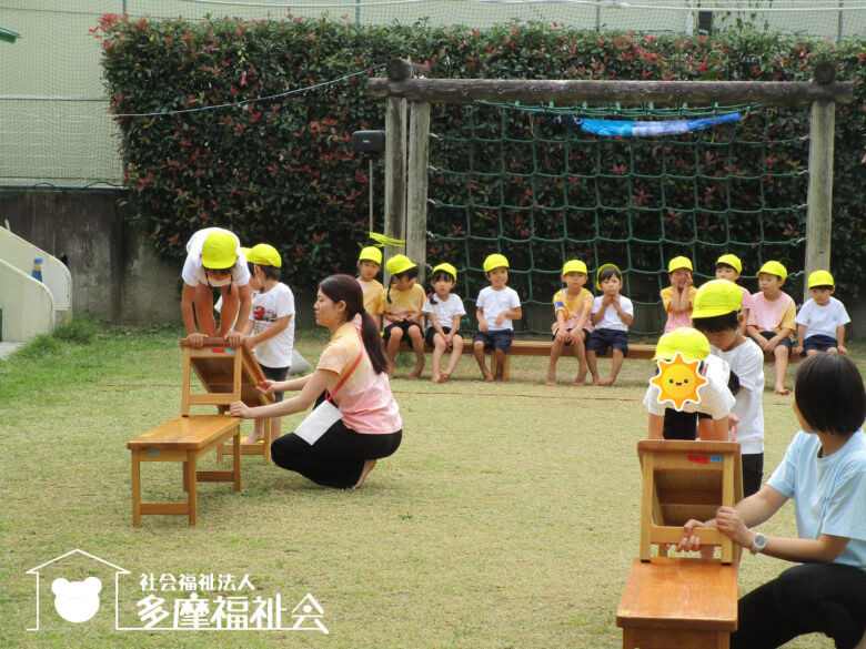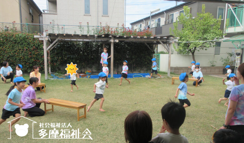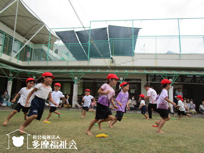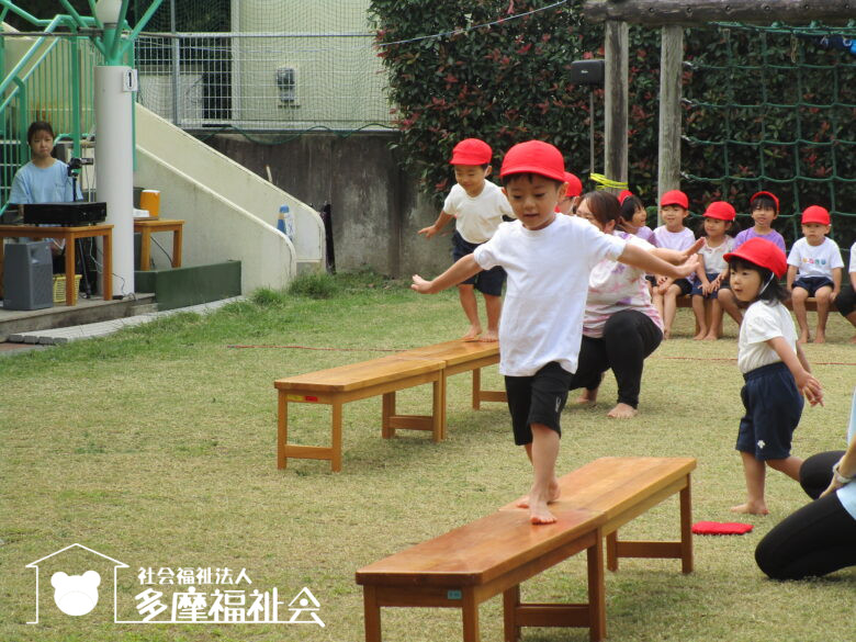 「歩き」「走り」をテーマに行います。うさぎさん(3歳)は「おまわりさん」、きりん(4歳)さんは「なりきり歩き」、らいおん(5歳)さんは「ジグザグ走り」に挑戦します。