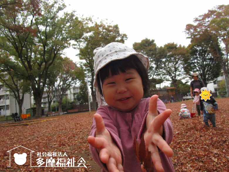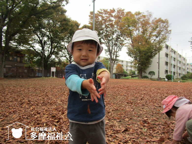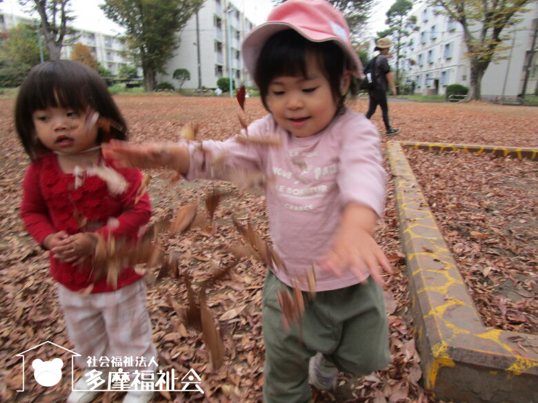 落ち葉の上を歩くと音がする!集めて上から落とすとパラパラと舞って面白いね!など