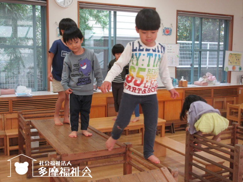 年下の子どもたちが、ろくぼくを平均台のように渡っていました。