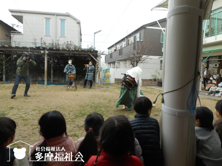 いよいよ獅子舞が登場すると、食い入るように獅子舞を見つめる子どもたち。