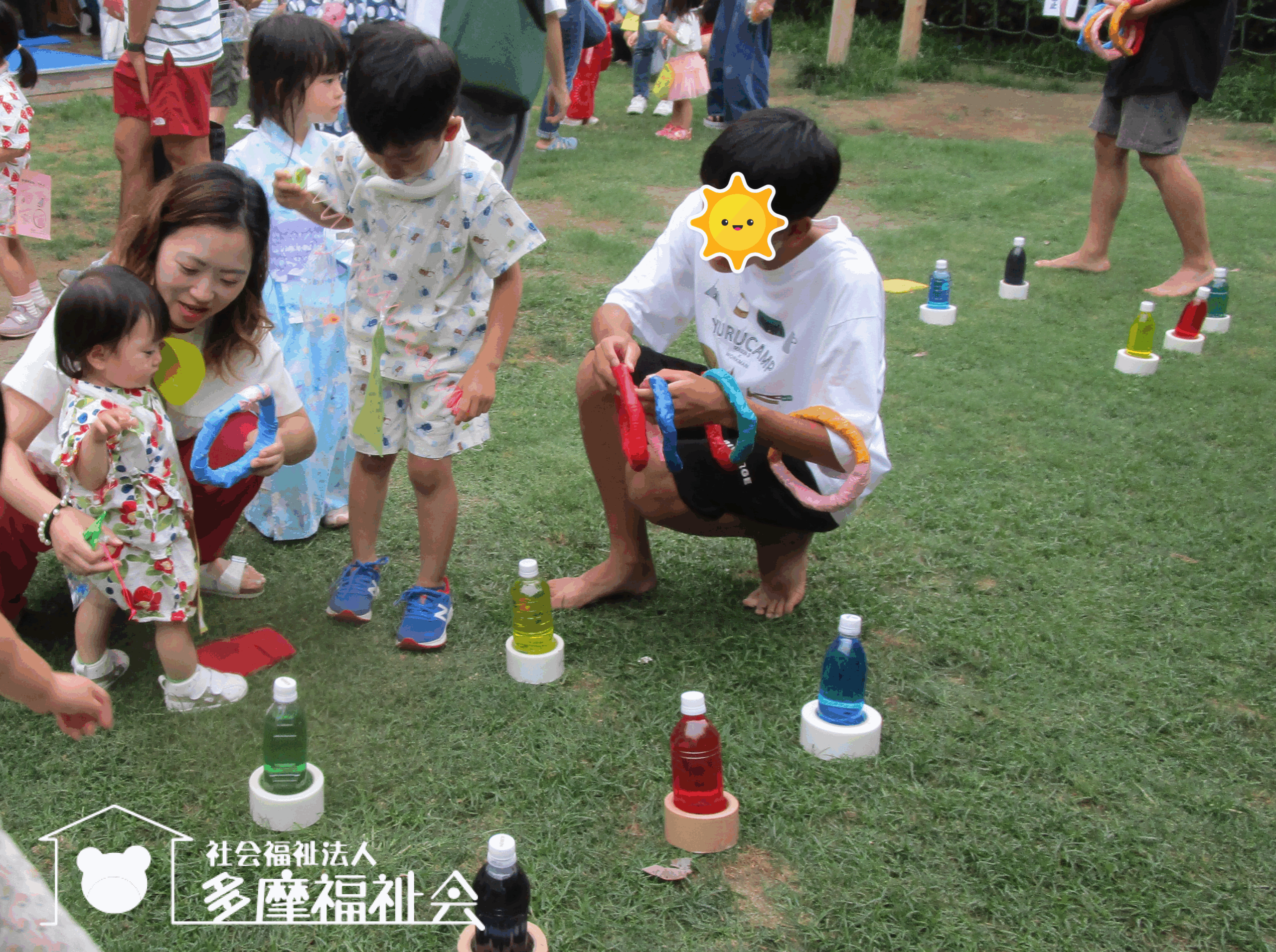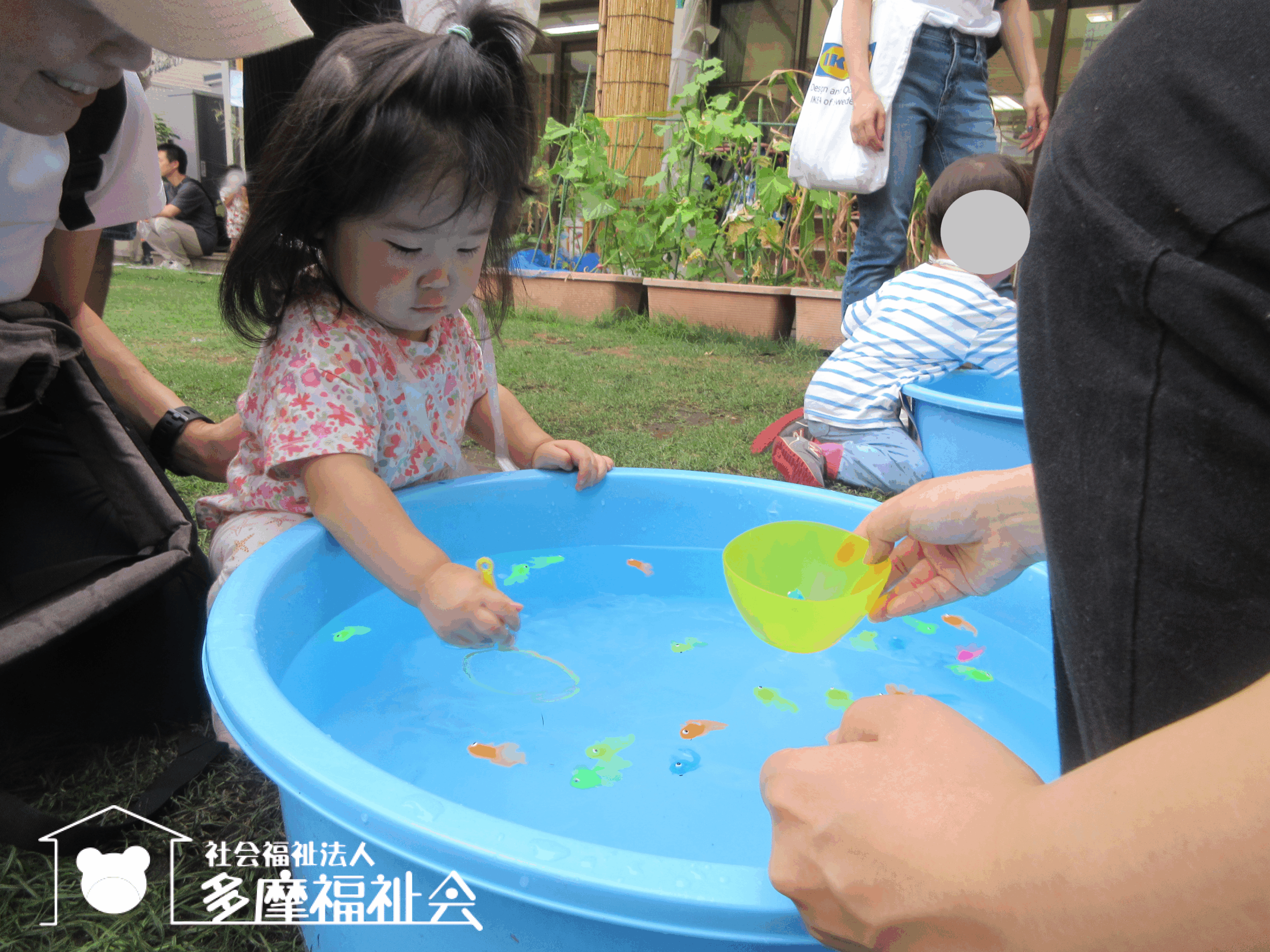 園庭で輪投げやおもちゃの金魚すくい、くじ引きなどができます。