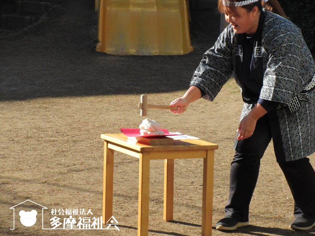 お話を聞いた後、12月の餅つきで作り、お供えした鏡餅を割りました