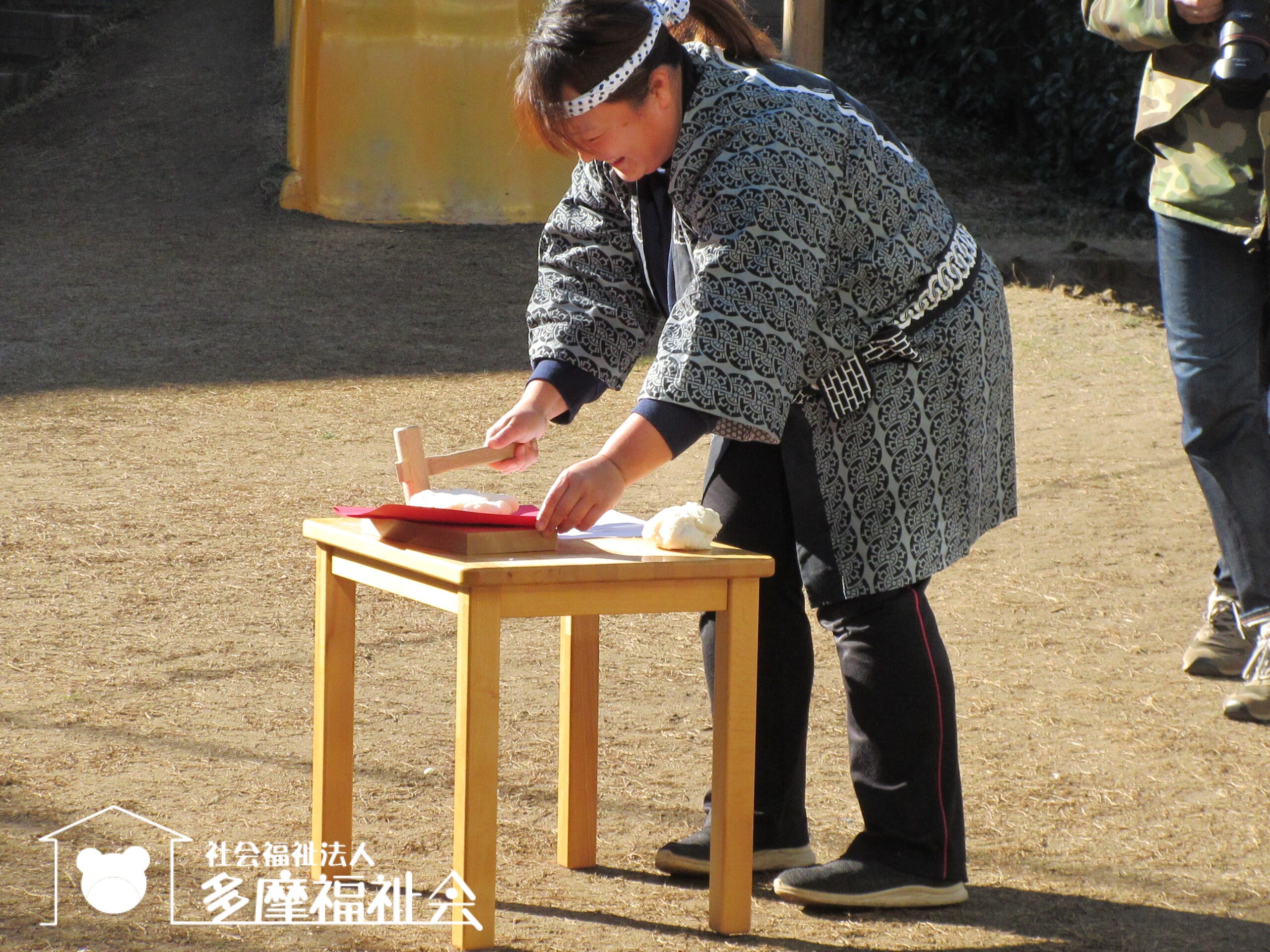 お話を聞いた後、12月の餅つきで作り、お供えした鏡餅を割りました