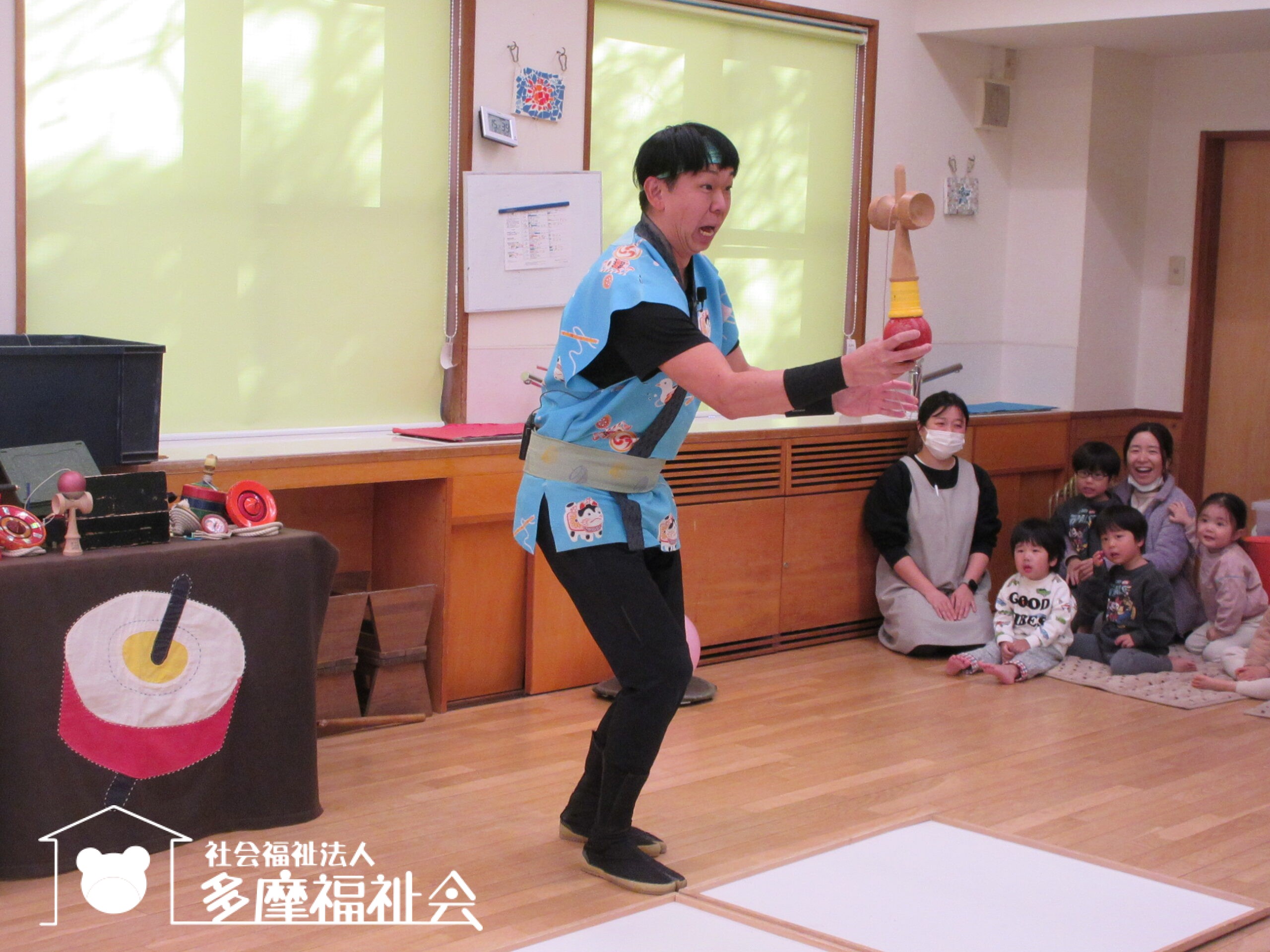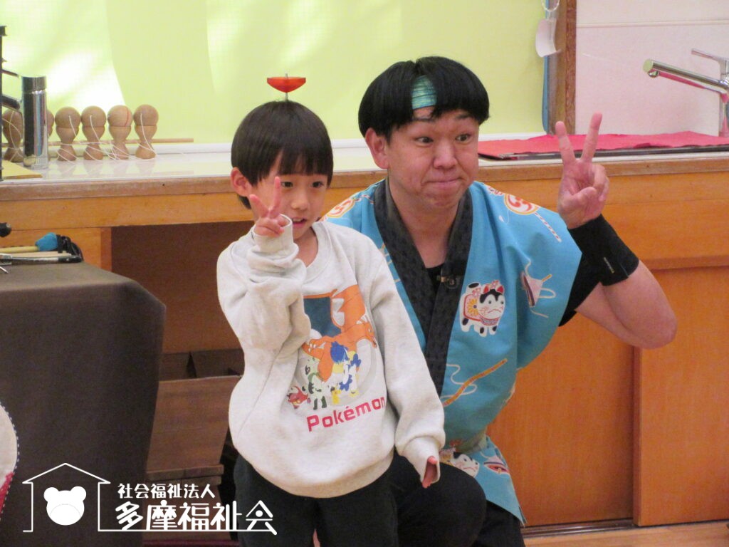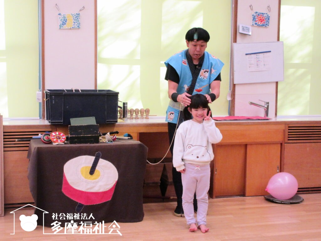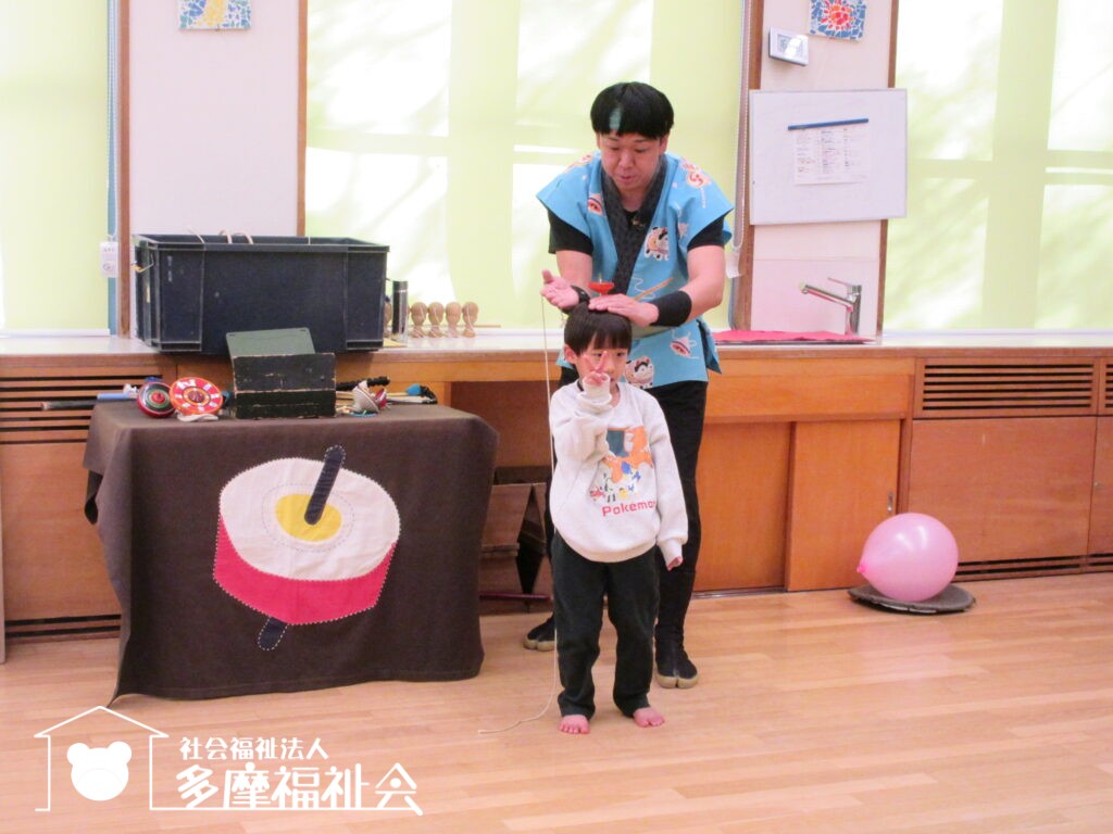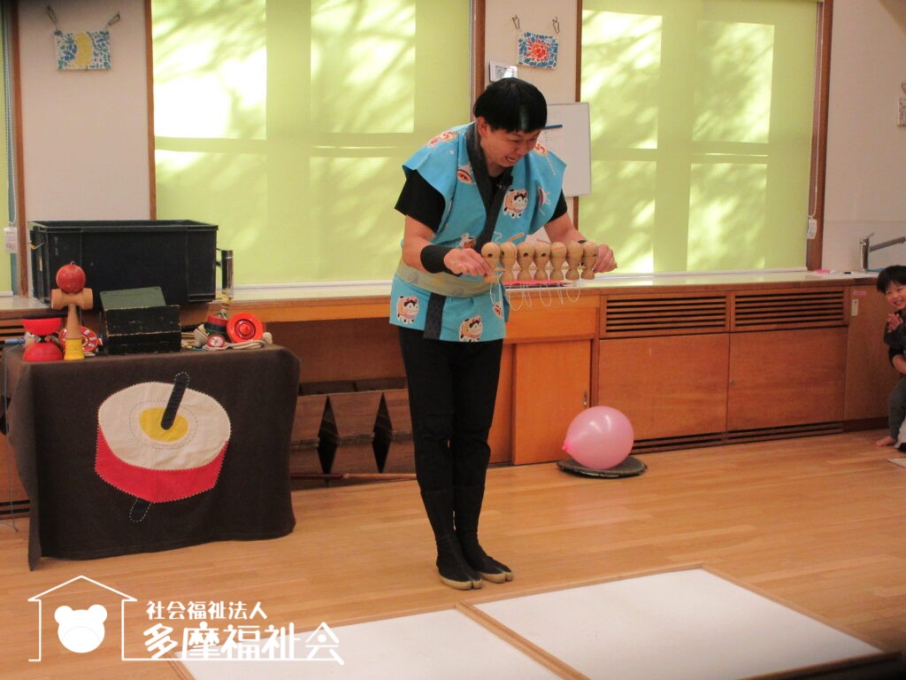 子どもたちと一緒にコマやけん玉のパフォーマンスを楽しみました。