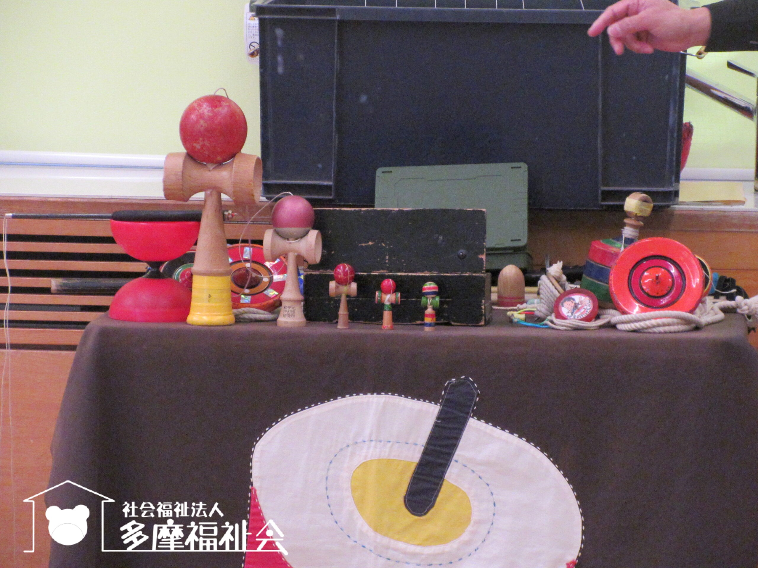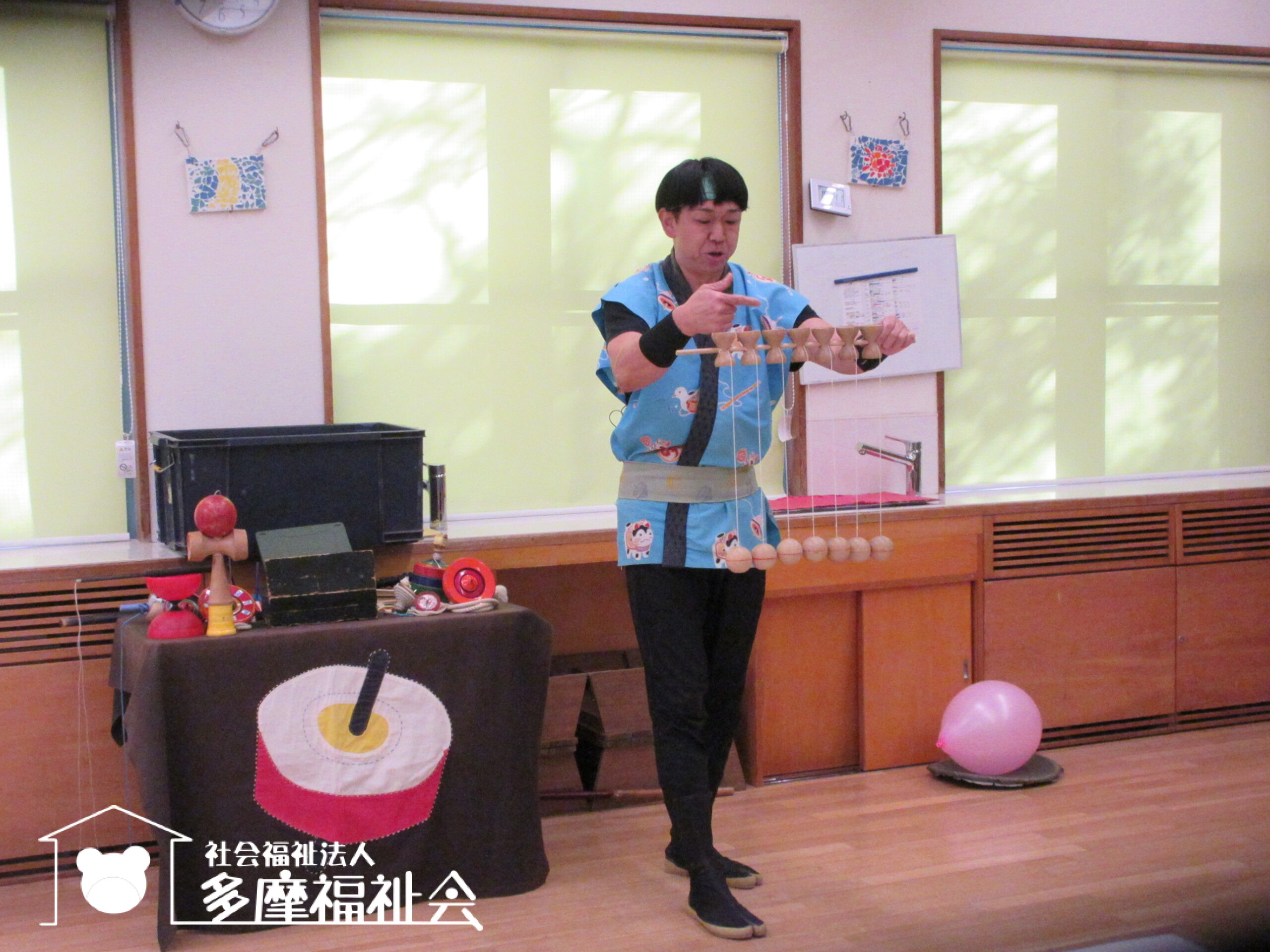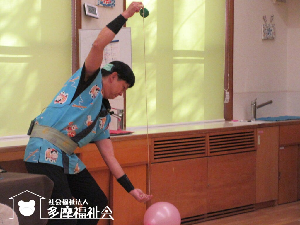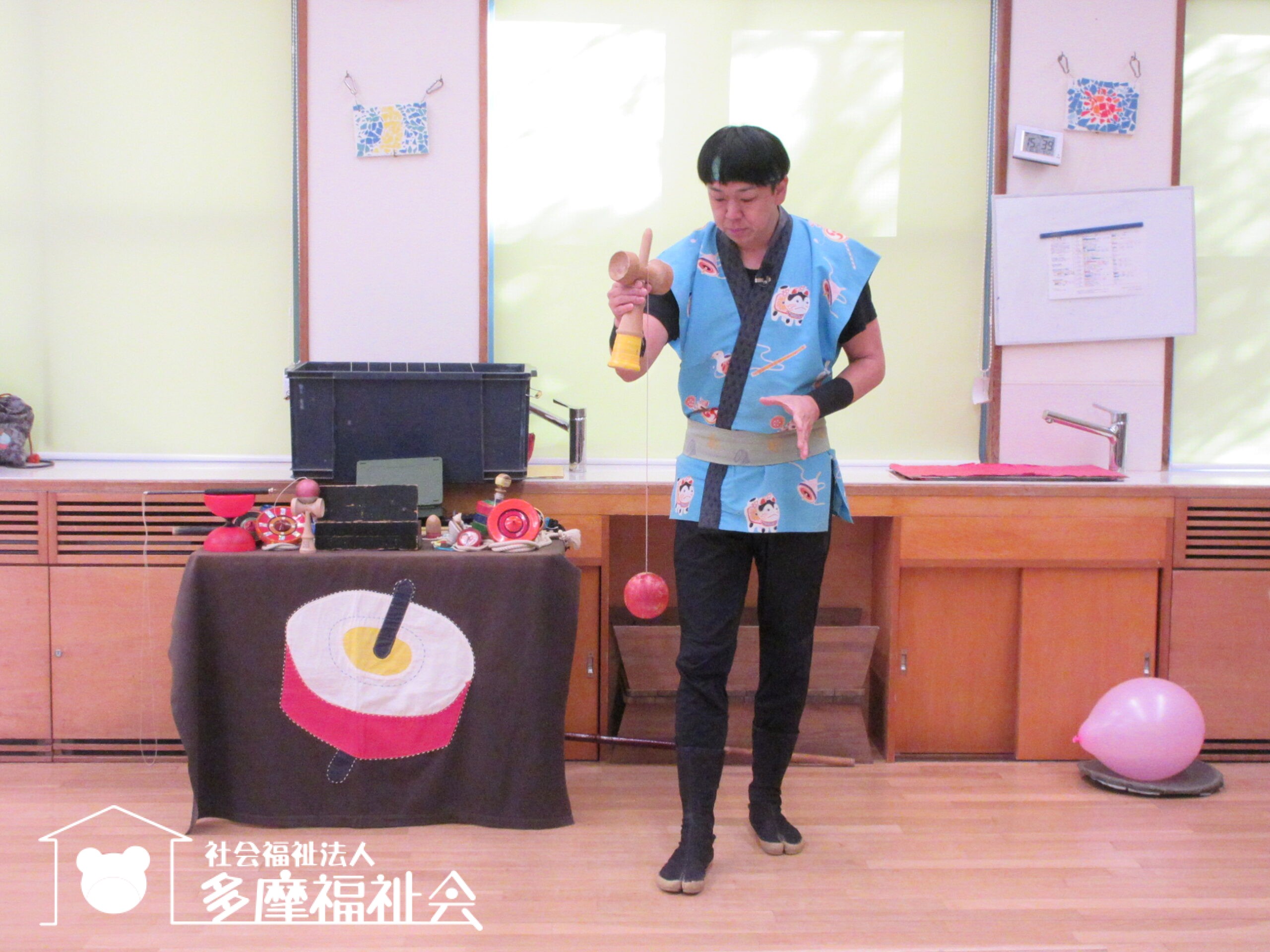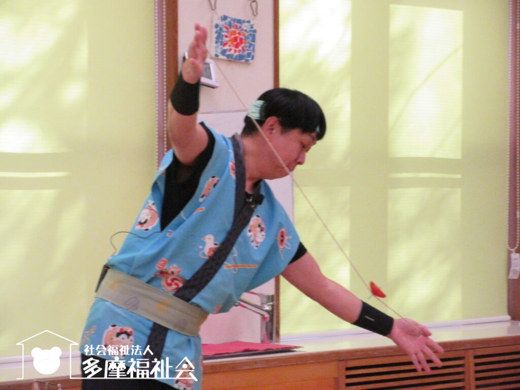 子どもたちと一緒にコマやけん玉のパフォーマンスを楽しみました。