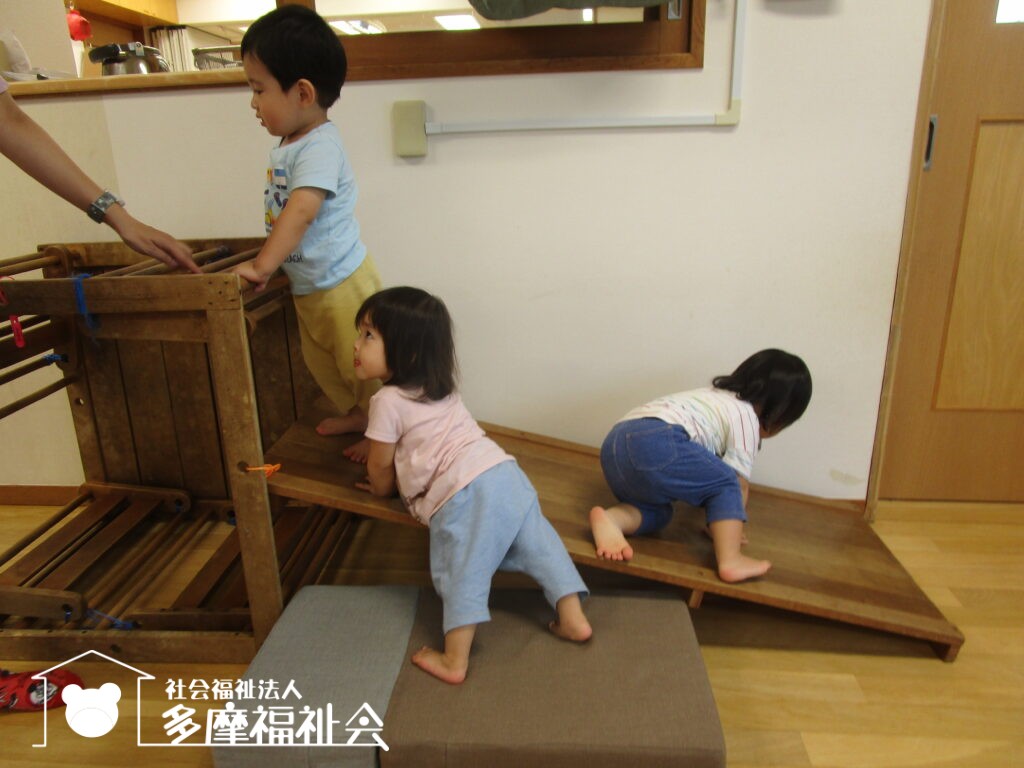 雨の日は室内で体を動かして遊びました。 斜面をよじ登ったり、すべり台のようにすべって楽しんでいます。  …