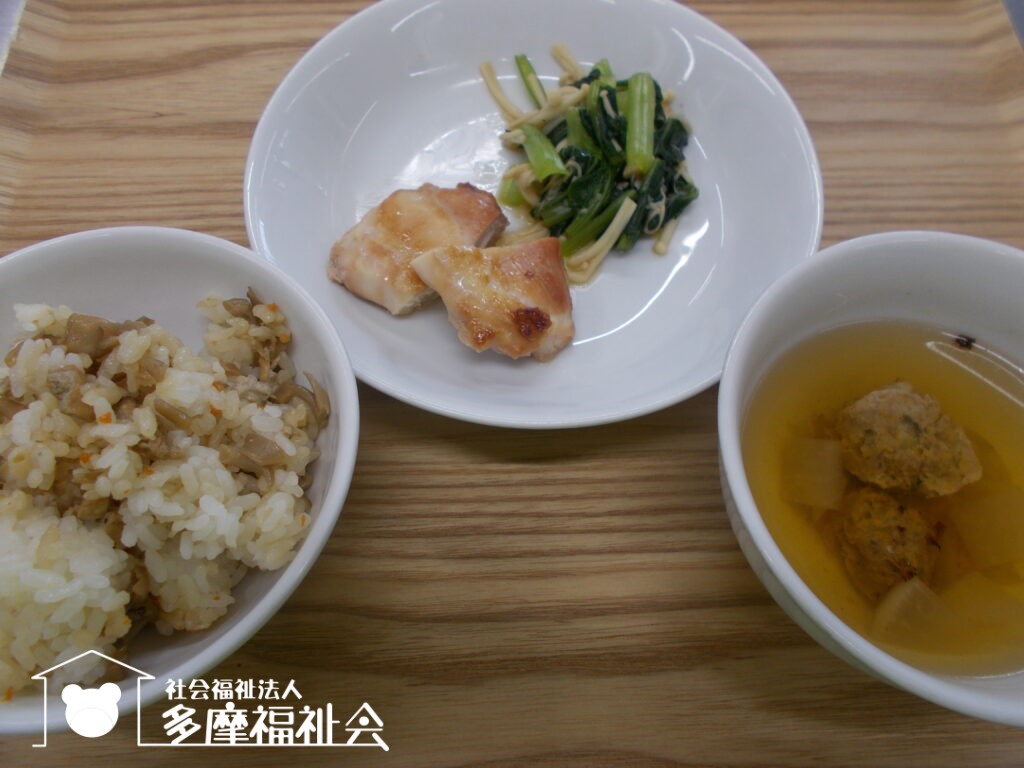 <昼食・幼児>まいたけ御飯 いわしの団子汁 鶏肉の照り焼き 小松菜とえのきのおひたし