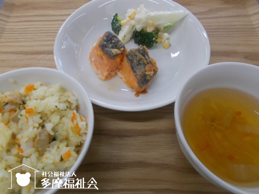 ・チキンピラフ・白菜のスープ・鮭のムニエル・ブロッコリーとカリフラワー、コーンのサラダ