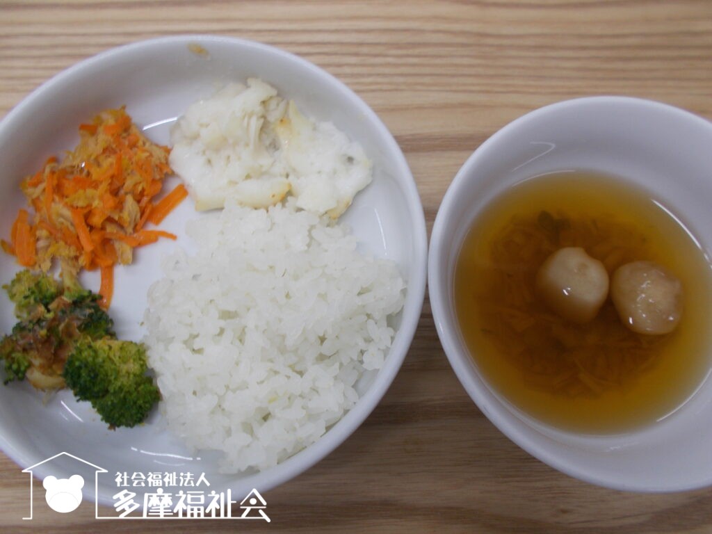 <昼食・乳児>ご飯 すまし汁 カレイの西京焼き 人参のツナ炒り ブロッコリーのおかか和え