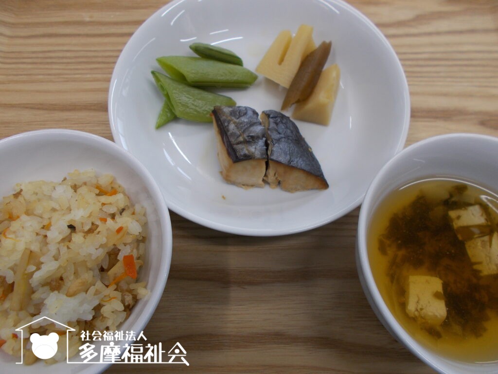 <昼食・幼児>筍ご飯 すまし汁 鰆の照り焼き 筍と蕗の煮物(乳児:じゃが芋の煮物) スナップえんどうの塩茹で