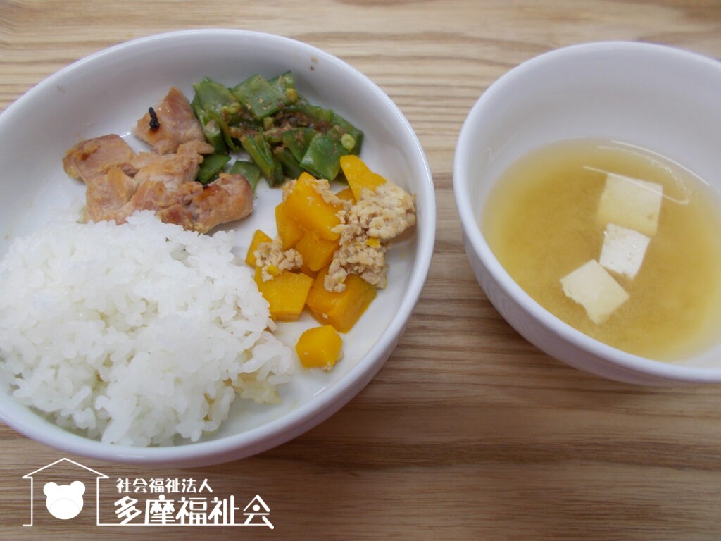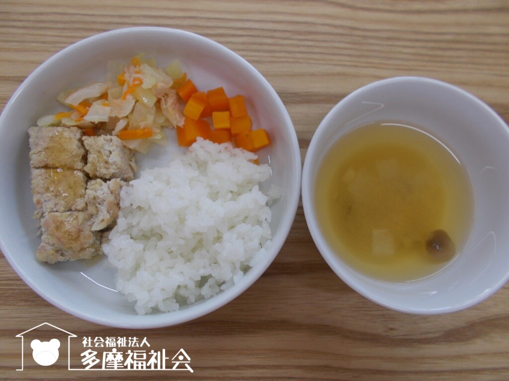 <昼食・幼児>ご飯 味噌汁 つくね煮 人参の甘煮 スナップエンドウのお浸し