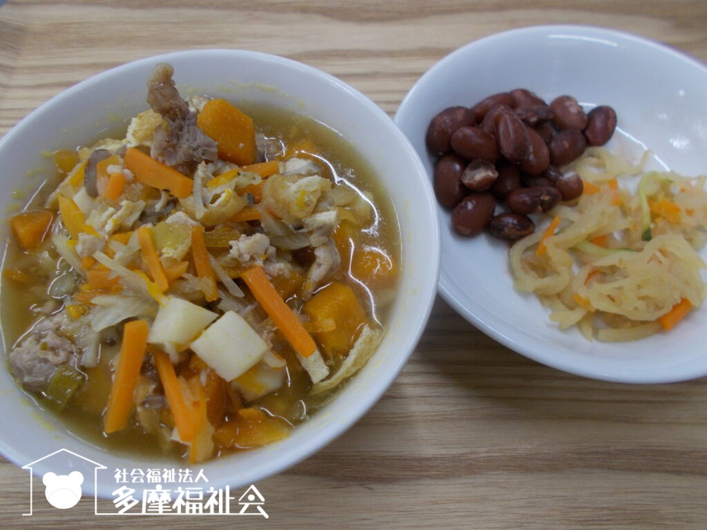 <昼食・幼児>ほうとう 金時豆の煮豆 きゅうりの酢味噌和え