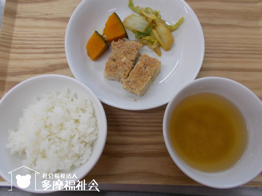 <昼食・幼児>御飯 味噌汁 松風焼き 南瓜の煮物 白菜のお浸し