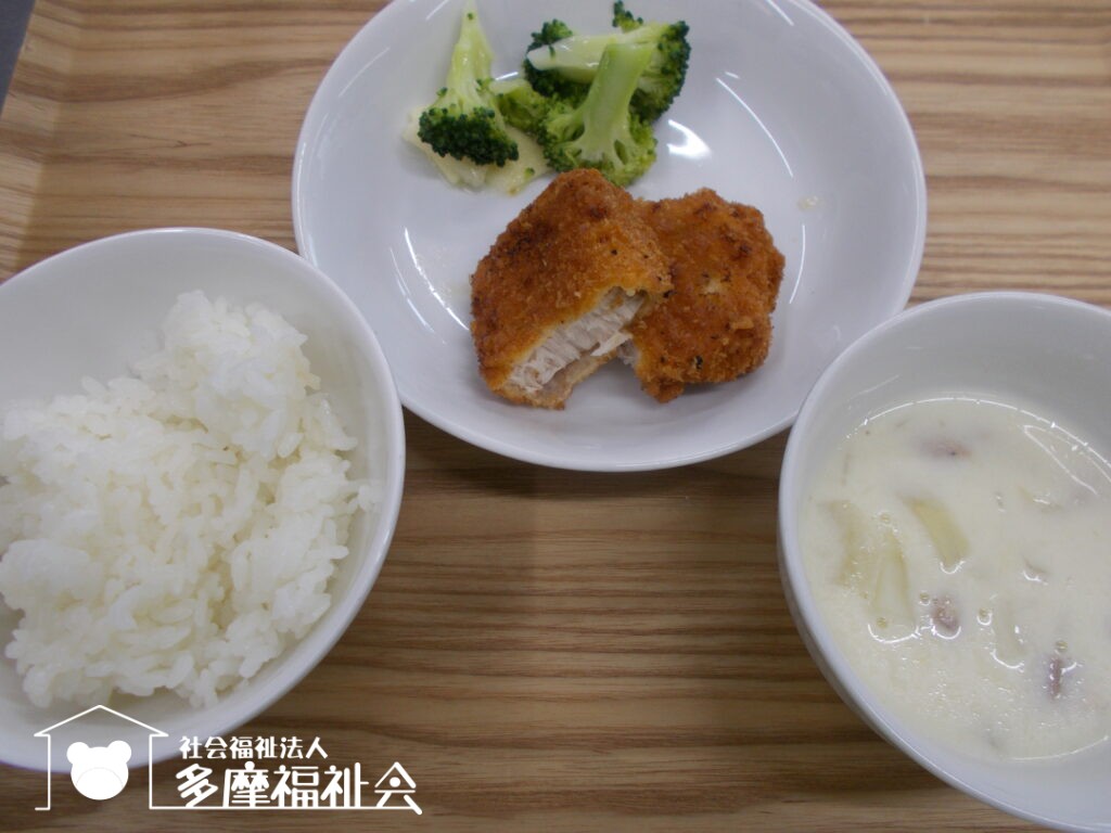 <昼食・幼児>御飯 クリームシチュー めかじきのフライ ブロッコリーとりんごのサラダ
