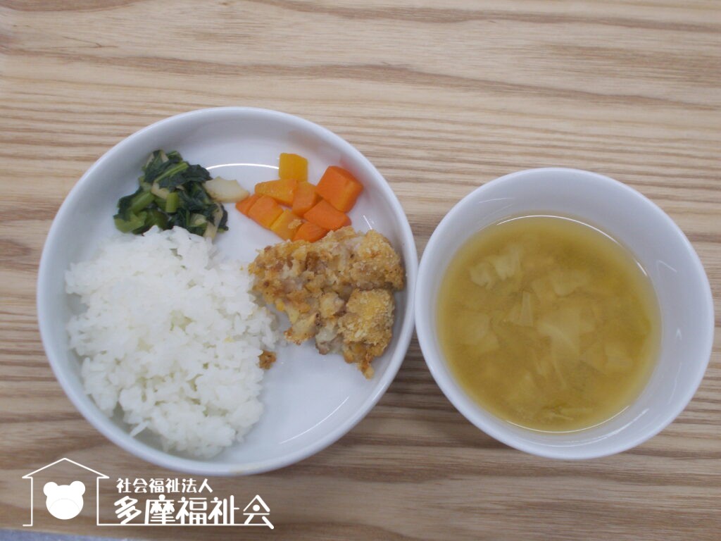 <昼食・乳児>ご飯 味噌氏 納豆コロッケ 人参の煮物 小松菜のお浸し