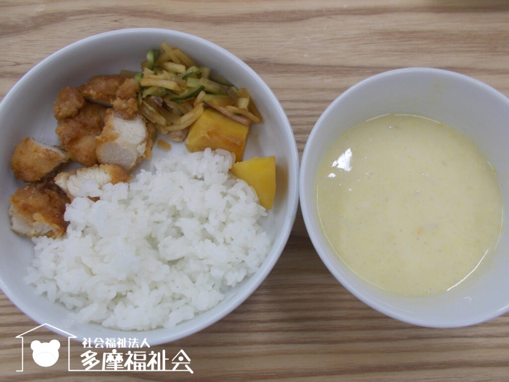 <昼食・乳児>ご飯 コーンスープ 鶏のから揚げ さつま芋のオレンジ煮 大根ときゅうりとハムのサラダ